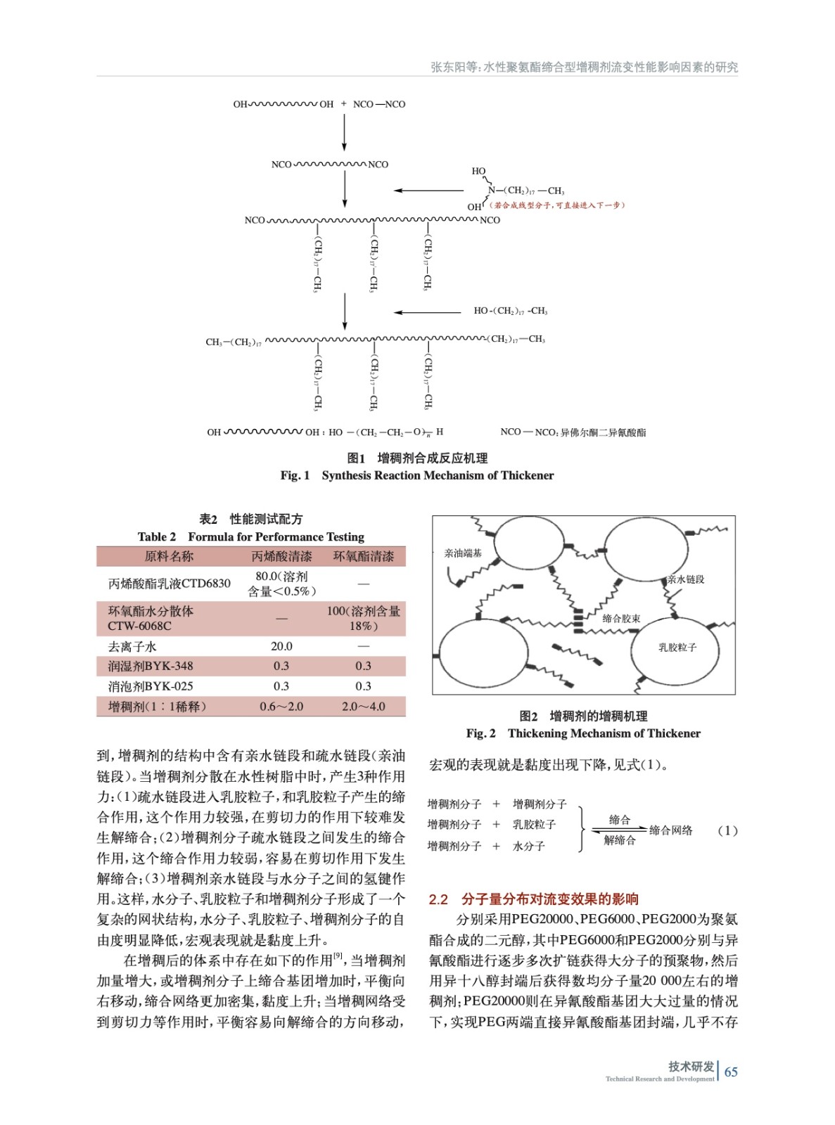 摘要:研究了分子量大小、分子量分布、增稠剂分子结构等对聚氨酯缔合型增稠剂在水性丙烯酸酯涂料中的流变性能的影响。进一步研究了不同分子结构的聚氨酯缔合型增稠剂在含溶剂的水性涂料中的增稠效果,为提高水性聚氨酯缔合型增稠剂在含溶剂水性涂料中的增稠效果提供一定的参考。