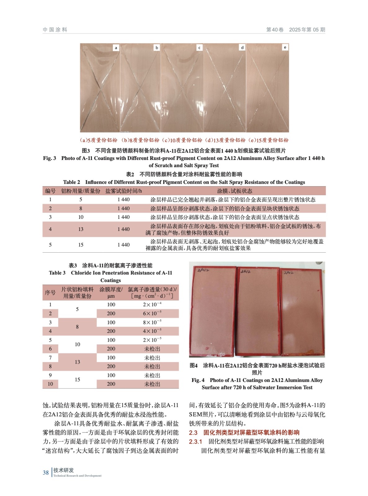 摘要:研发了一种适用于铝合金表面的屏蔽型防腐蚀涂层A-11,通过调节其屏蔽填料用量、固化剂种类对其在2A12铝合金表面的耐盐雾性、氯离子屏蔽性能展开研究,并对其物理性能进行了表征,包括黏结强度、韧性、耐冲击性能等。结果表明,当铝粉含量为15质量份,环氧涂层A-11对2A12铝合金具备良好的耐盐雾、耐盐水、防锈蚀能力,在1 440 h的中性盐雾试验过程中,做到无起泡、无锈蚀、无脱落;在720 h的盐水浸泡试验中无起泡、无锈蚀、无脱落。另外环氧涂层A-11在2A12铝合金表面具备良好的黏结强度,达到了12.74 MPa;具备较为良好的韧性与耐冲击性能。同时,研发的涂层A-11具备良好的施工性能,未来在铝制船舶、设备、海工装备等的腐蚀防护中具有积极作用。