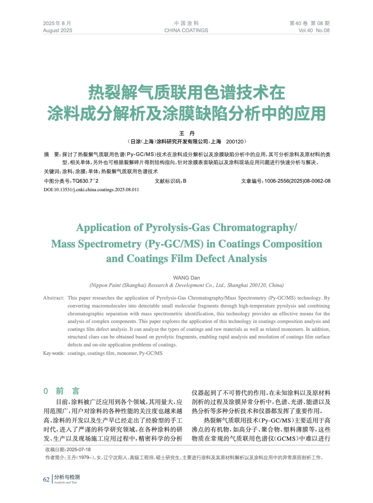 热裂解气质联用色谱技术在涂料成分解析及涂膜缺陷分析中的应用