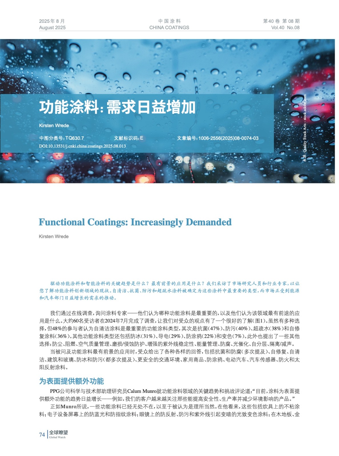 摘要:编者按:驱动功能涂料和智能涂料的关键趋势是什么?最有前景的应用是什么?我们采访了市场研究人员和行业专家,以让您了解功能涂料创新领域的现状。自清洁、抗菌、防污和超疏水涂料被确定为这些涂料中最重要的类型,而市场正受到能源和汽车部门日益增长的需求的推动。